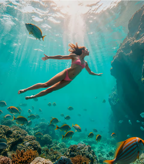 Begin your day with a delicious onboard breakfast, refreshing drinks, and a seasonal fruit basket. Dive into the vibrant underwater world with two snorkeling stops, exploring crystal-clear waters and colorful coral reefs.